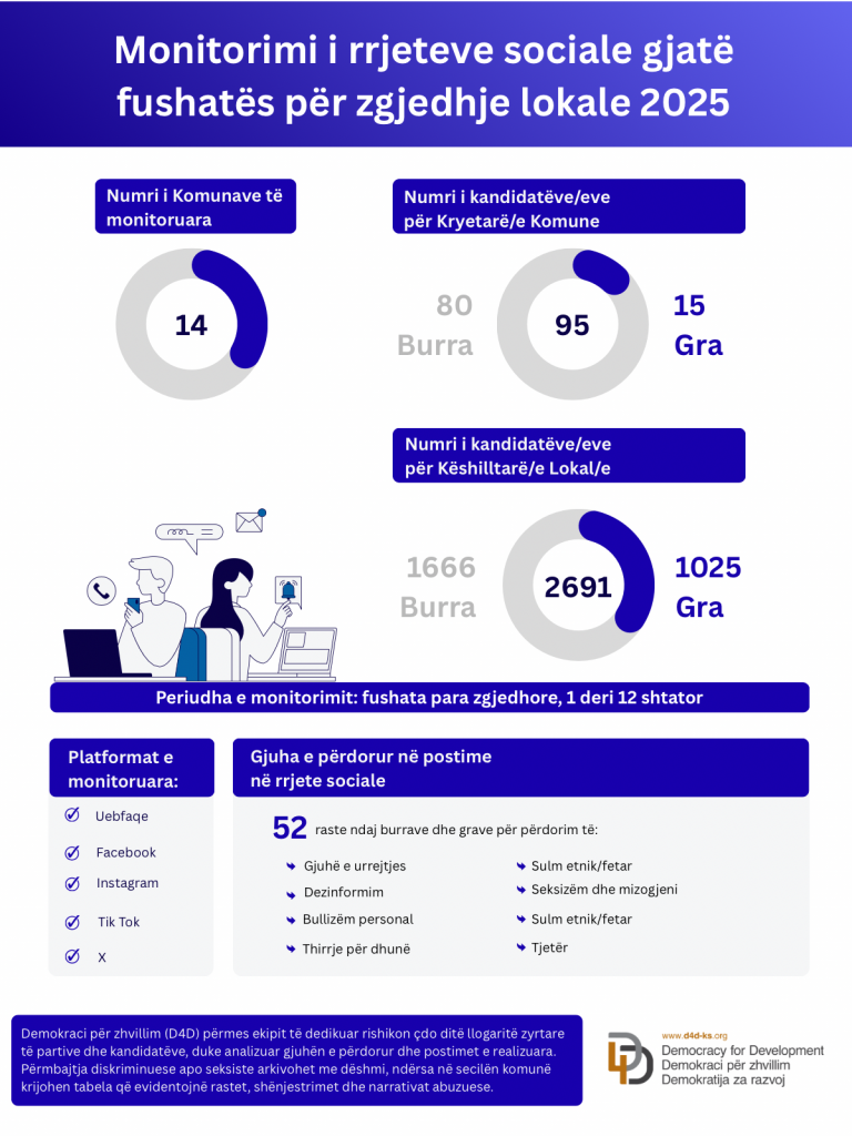 https://d4d-ks.org/en/infographics/hate-speech-against-women-on-online-media The report “Monitoring the Code of Conduct on the Responsible Use of Social Media during the 2025 Local Elections,” conducted by Democracy for Development (D4D), analyses political communication on social media during the campaign period of the local elections held on October 12, 2025. The main objective of the report is to assess compliance with […]