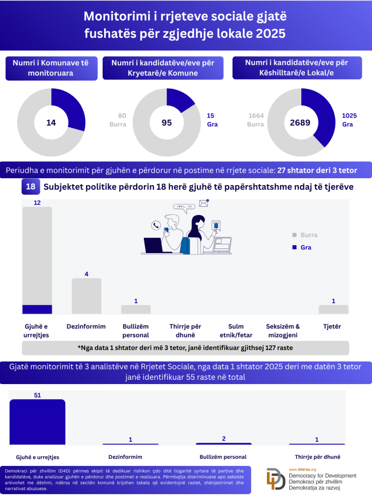 Të dhënat tregojnë se sfidat në komunikimin politik online mbeten të pranishme. Monitorimi është zhvilluar në platformat kryesore të përdorura nga partitë dhe kandidatët: faqet zyrtare, Facebook, Instagram, TikTok dhe X.